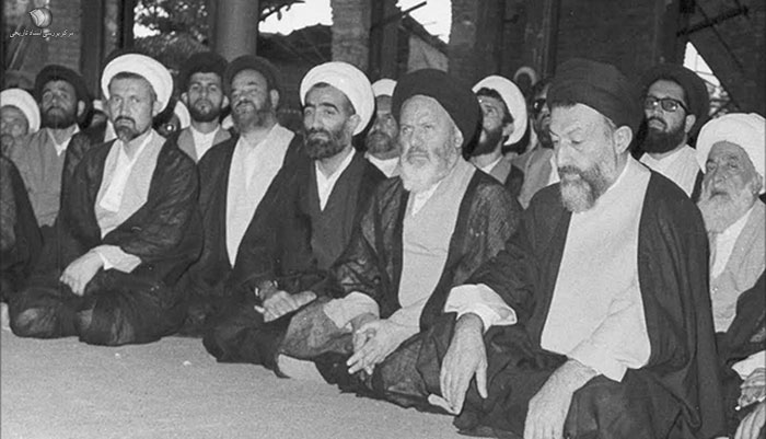 آیت الله سید عبدالکریم موسوی اردبیلی در کنار شهید آیت الله بهشتی، آیتالله مؤمن و آیتالله ربانی املشی در دیدار با امام خمینی – ۱۳۵۹