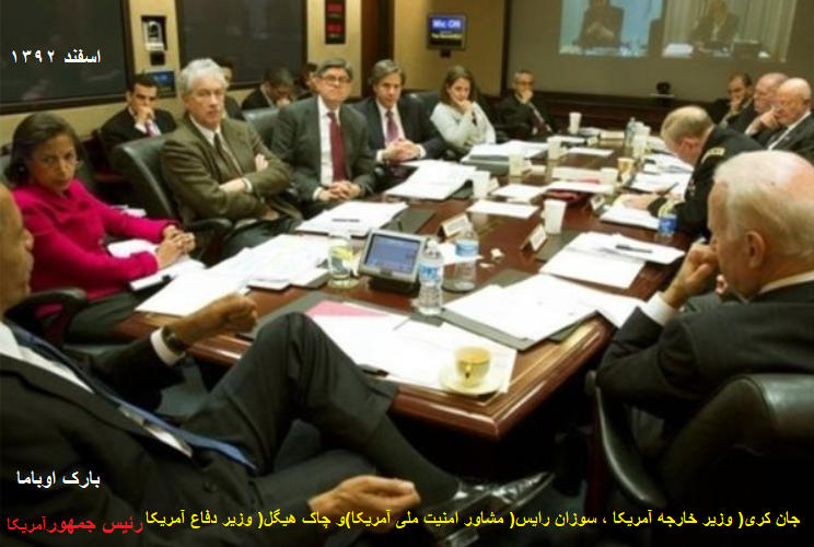 «بارک اوباما»رئیس جمهورآمریکا ، «جان کری» وزیر خارجه آمریکا ، «سوزان رایس»مشاور امنیت ملی آمریکاو «چاک هیگل» وزیر دفاع آمریکا از جمله افرادی بودند که در این نشست شرکت داشتند.اسفند۱۳۹۲