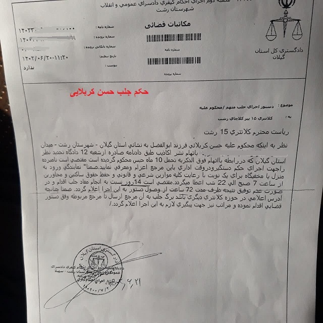 «حسن کربلایی» بجرم نشراکاذیب به ۱۰ماه حبس و ۲ سال محرومیت ازفعالیت های سیاسی واجتماعی وعضویت دراحزاب محکوم شده است ودر ۱۲ مهر ۱۴۰۲ دستگیر وبه زندان منتقل شد وهم اکنون دوران محکومیت رامی گذراند.