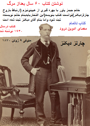 توضیح مدیریت سایت-پیراسته فر:چارلز دیکنز(متوفی ۱۲۴۹شمسی) وخانم توماس جیمز پاور(متوفی ۱۳۴۱شمسی)،خانم جیمز پاور با بهره گیری از هیپنوتیزم (ارتباط باروح چارلزدیکنر)توانست کتاب بنویسد(این افتخاربایدبنام خانم نویسنده ثبت شود واما بنام آقای دیکنز ثبت شده است!.
