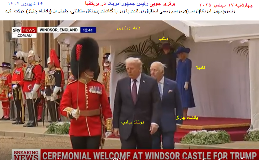 توضیح مدیریت سایت-پیراسته فر:رئیس‌جمهور آمریکا(ترامپ) درمراسم استقبال رسمی در لندن با زیر پا گذاشتن پروتکل سلطنتی، جلوتر از«چارلز»(پادشاه انگلیس) حرکت کرد۱۷ سپتامبر ۲۰۲۵ (۲۶ شهریور ۱۴۰۴)