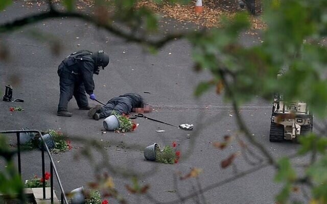 ویدئویی که در رسانههای اجتماعی منتشر شده و توسط سیانان موقعیت جغرافیایی آن مشخص شده است، نشان میدهد که مأموران مسلح پلیس در حالی که سلاحهای خود را به سمت فردی که روی زمین افتاده است، نشانه گرفتهاند، با فریاد به رهگذران و نمازگزاران در داخل کنیسه دستور میدهند.
