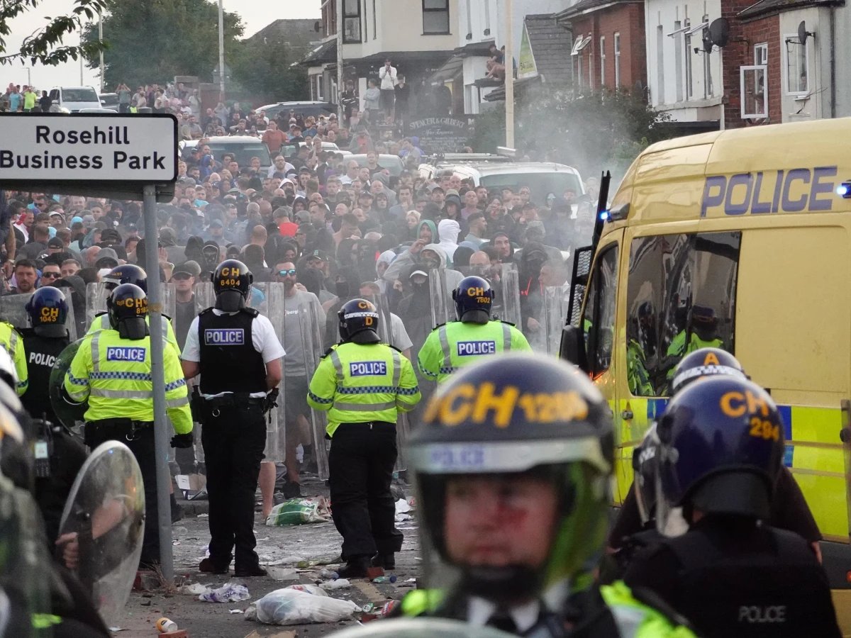 پلیس ضد شورش معترضان را پس از وقوع ناآرامی در ۳۰ ژوئیه ۲۰۲۴ در ساوتپورت، انگلستان مهار کرد.